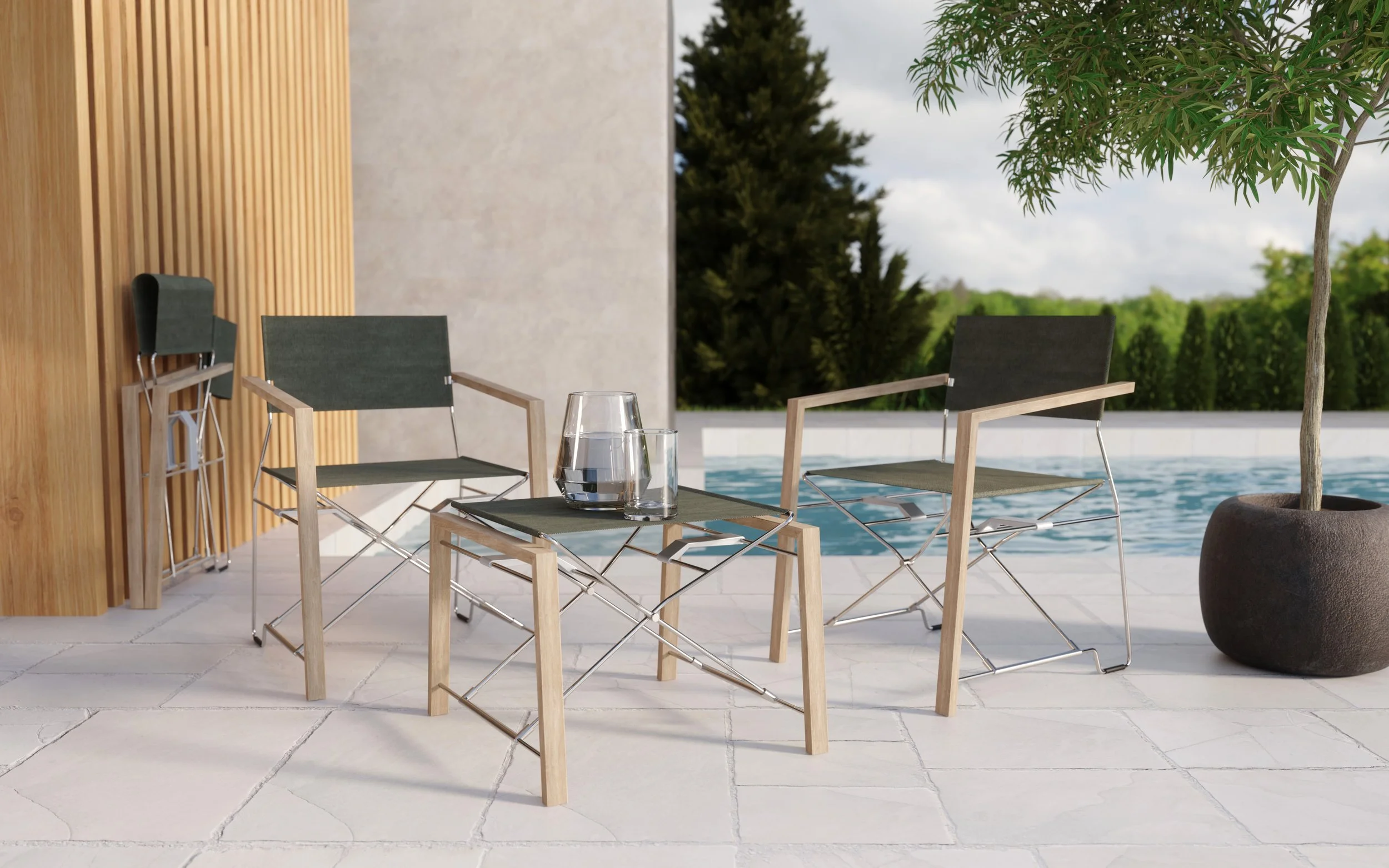 The Directa Chair redefines the traditional director’s chair by emphasizing the features that made the original design enduring...folding, portability, comfort, and style. Warm teak provides a tactile, welcoming foundation, while stainless steel rods create an impossibly light yet strong folding mechanism. This thoughtful material pairing results in a chair that feels both grounded and weightless.